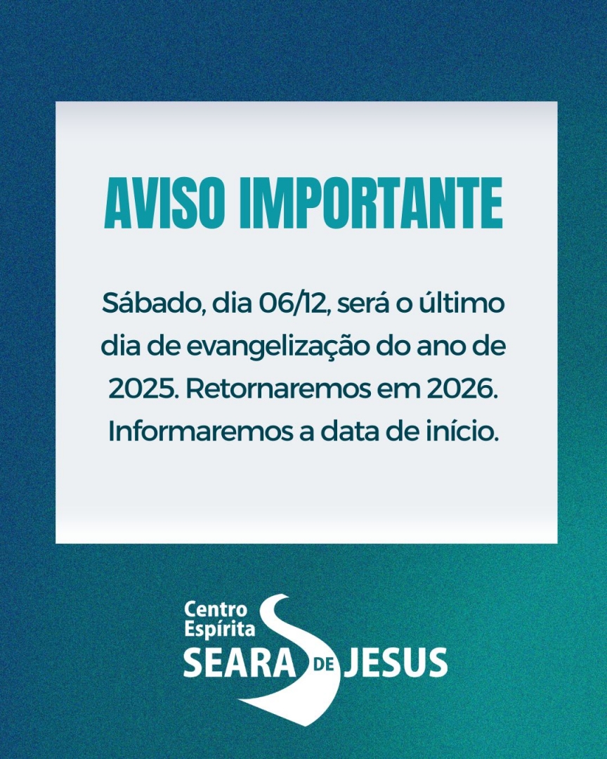 Informamos que entraremos em férias na Evangelização, do Centro Espírita Seara de Jesus, no sábado, 06/12/2025. Informaremos a data de regresso.