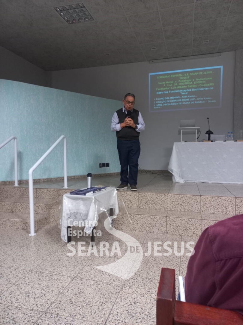 Seminário "Saúde Mental, Mediunidade e Psicologia à Luz da Doutrina Espírita", ocorrido em 23 de agosto de 2025, no Centro Espírita Seara de Jesus, com Luiz Alberto dos Santos, de Guaíba (RS).